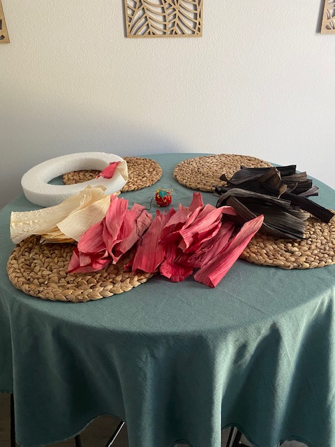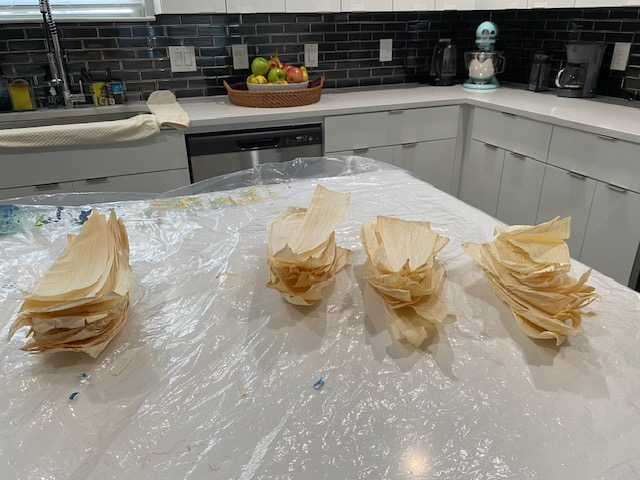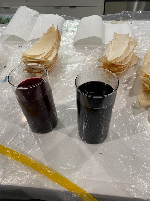 - Follow manufacturers instructions for dyeing the husks. I used this tutorial: https://www.ritdye.com/2017/11/15/dyed-corn-husks/. I dyed two piles, one red and one black, and left the third pile natural. Also, if you don’t have something already, a plastic couch cover has been very useful in protecting my kitchen countertop whenever a project is messy. It’s cheap, durable, and much more easy to store than the big blue heavy duty tarps. I let my husks dry overnight.