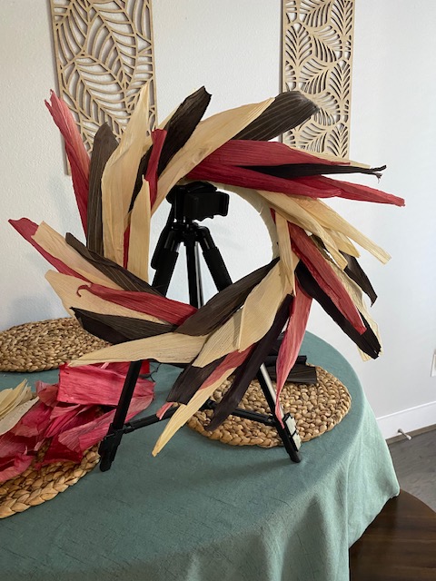 - Cover the inside and top of the wreath with the remaining husks, following the same direction you are working in. Again, tuck the new corn husk under the old so there are no gaps. Sometimes I have a flash of genius, and went and pulled out a tripod I’ve used once for Christmas photos to hold the wreath up while I was working. It really took some of the frustration out of the process.
