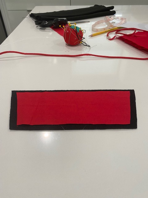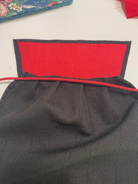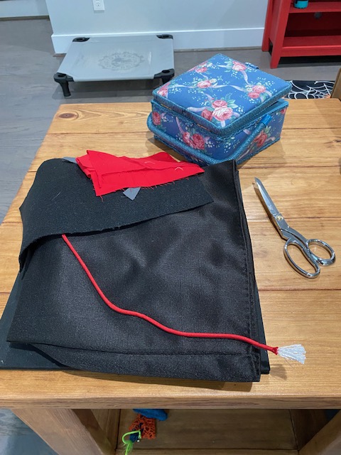 All these supplies I had on hand, scraps from one project or another. If you don’t have a supply to draw from, the scraps pile at Joanns is a great place to look for the material you need. The red cord was from when I was making my own COVID masks, glad to finally be rid of it!