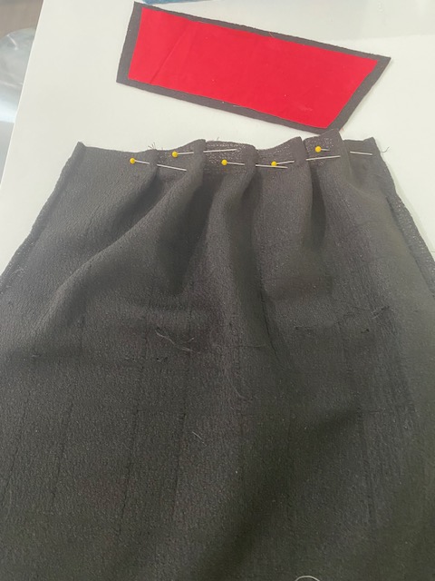 - Place your cord along the top of the cape, ensuring enough overhang on either side to allow you to tie it in the end. Tuck the fabric under the cord, making sure the cord is completely covered. Pin trapezoid on top. Sew along the edge. While doing this I worked an inch at the time, since the pins I have are big and weren’t really keeping things in place.