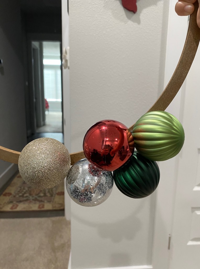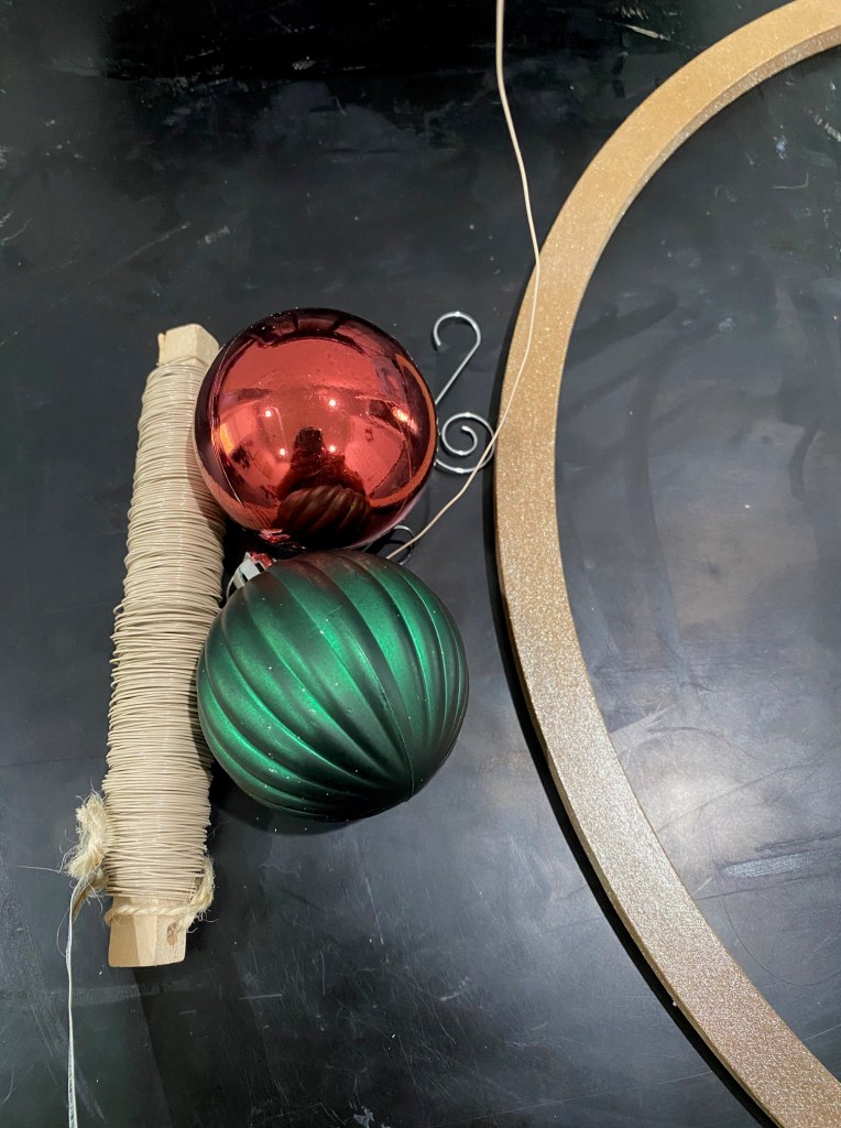 2. Gather your ornaments and wire. Measure out about 4 inches of wire for each ornament, to ensure enough to go around and twist in the back. Place each ornament along the hoop, twisting the wire into a spiral in the back to hold in place. Your ornaments will flop around, so hold up your wreath once in awhile to ensure they fall where you want them to be. Place the smaller ornaments in the gaps in the same manner. It took me about two tries, but I finally got the ornaments placed the way I wanted.