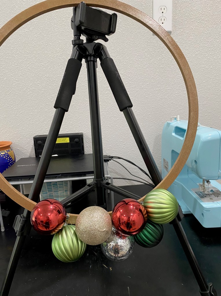 I saw a similar hoop on Grandin Road that I though would look great above my little bar cart, however it cost a cool 200 bucks. Knowing I could do something similar for less I went and got my Christmas ornaments from the top of the garage. I wasn’t able to find any conical shaped ornaments though. The great thing about making your own is you can blend with your existing Christmas decorations. Working with the wire definitely tested my hand’s dexterity, but the end result was worth it, I think. Also, notice the Halloween fleece I bought way back when is being repurposed as snow.