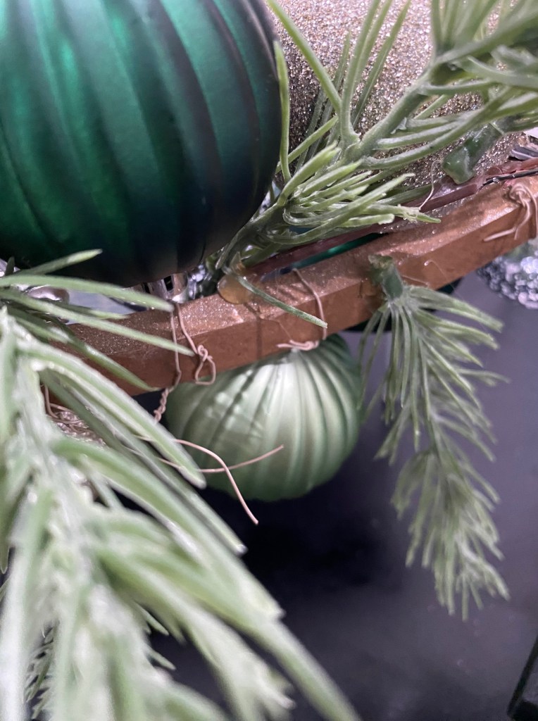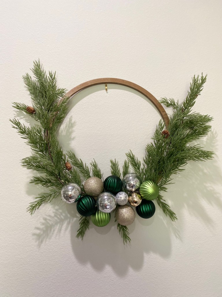 3. Place the greenery on either side of the hoop so it fans out and up. Tie into place with more wire or use a glue gun. I needed to tie it further up the hoop as well as the bottom for it to stay in place. Using individual leaves, glue more greenery at the top and bottom of the ornaments, using it to cover any gaps.