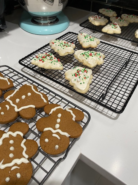 Prep your pans by lining them with a silicone mat or parchment paper. Roll out dough to 1/4 inch thickness over a counter dusted with flour, and cut out in desired shapes. Lightly flouring your cutters, rolling pin, and spatula is helpful as well. Bake at 350 F for 8-9 minutes, turning the pan around at the 4 minute mark. As an aside, quickly turning your pan is recommended for most baked goods, as it ensures an even bake. Every oven has hot spots. Repeat until the dough is gone. Now, a lot of recipes will say only use scraps once, but I don’t like to waste food, so your call. This advice is given because rolling the dough many times will make it tough, but I’ve honestly never noticed. Santa won’t care, will he?