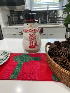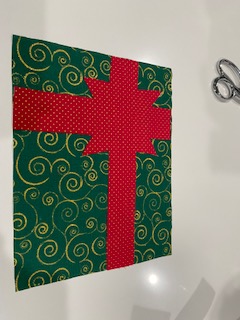 Still trying to get through my red and green Christmas fabric. I decided to make a runner for my island. If you’ve ever peeked at my kitchen, it is a lot of white. I’ve seen a couple of runners with a Christmas present motif, and decided to design my own that was a bit simpler. I wanted this done by Christmas. I’ve attached the pattern if you’d like to make your own runner or patchwork quilt. I attached the ribbon by applique, and then used an old tablecloth to make the border and back.