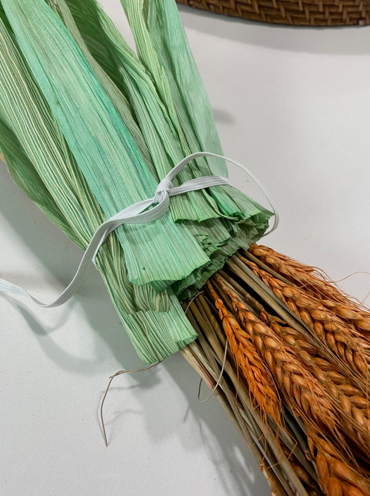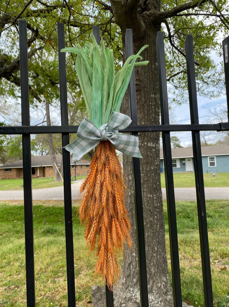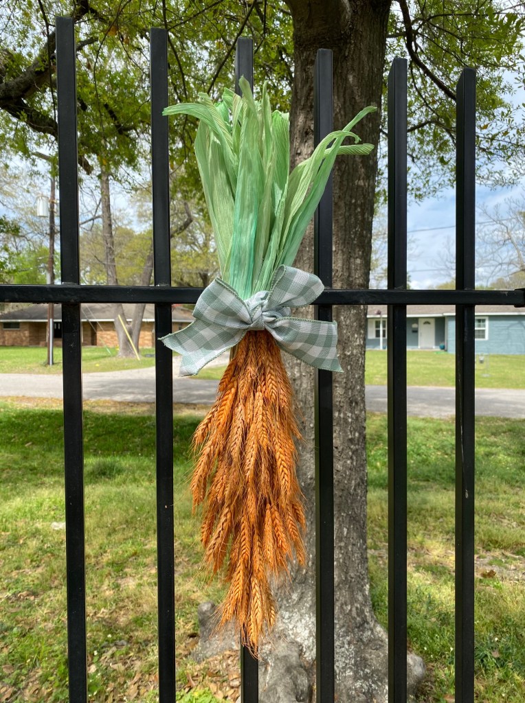 Grab your corn husks. Cut out about 10 inches of elastic and place under your carrot. With one hand, place the corn husks at the top of the carrot, trying your best to keep the husks even. With the other hand, grab the elastic and tie together as tightly as you can. At this point, you can adjust the husks and any stalks that have gotten out of place. I had to stick some back up into the elastic part and cover some bald spots. Cut off the excess wheat stalk at the top. Tie with ribbon, and if desired, make a loop to hang using wire or ribbon. Enjoy!
