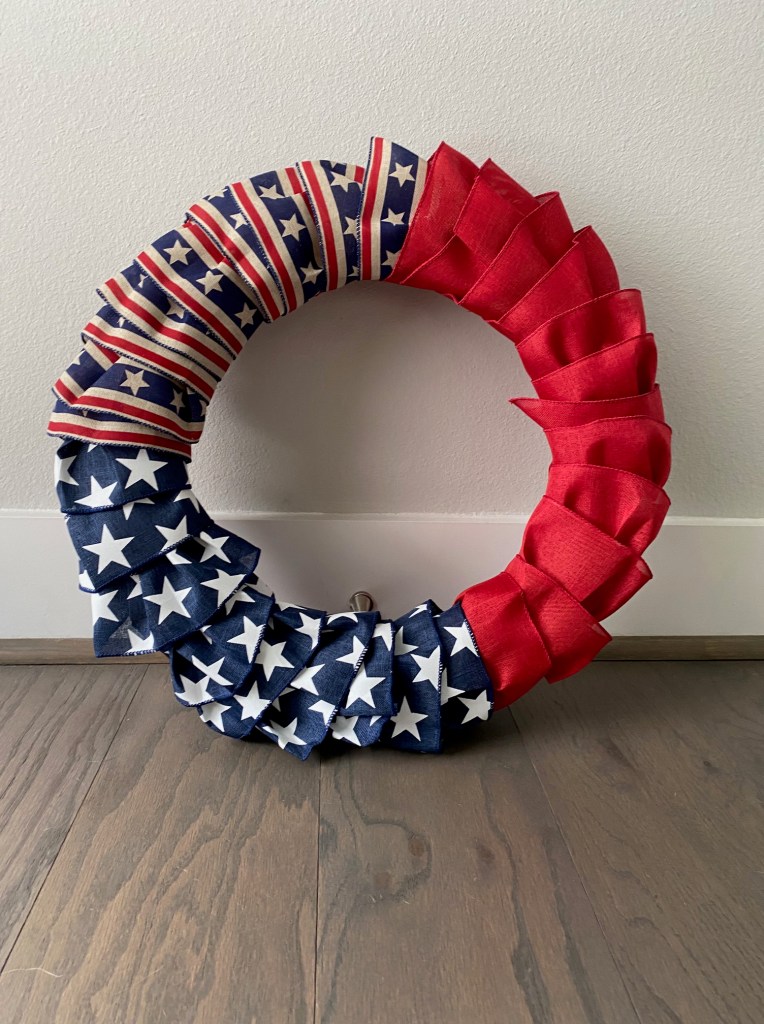 Mark off your wreath in thirds using pins. For my wreath, I needed about 9 individual pieces of ribbon per section. Choose the first ribbon you’d like to work with, and cut approximately 12 inch long strips. Pleat the ribbon 3 times, and wrap around the wreath, pinning it in the back. Sew the ends of the ribbon to the wreath, doesn’t have to be more than a few stitches, and again in the middle to secure.