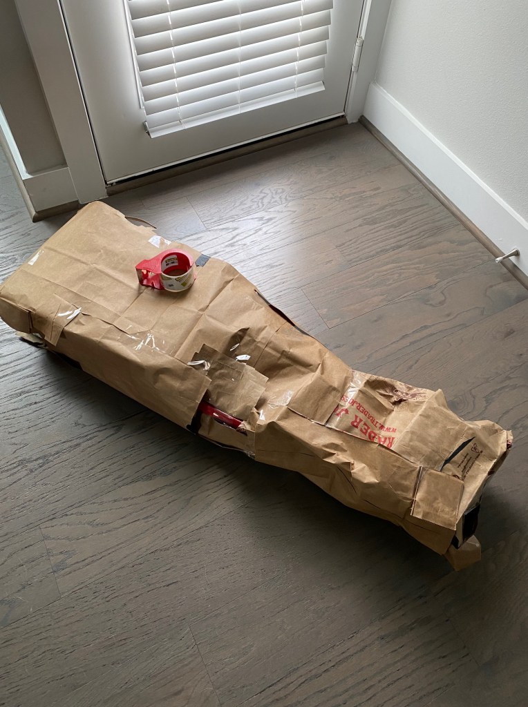 For the head, I used balled up packing paper and plastic bags to my a round shape, held in place with more packing tape. I really should’ve splurged for the Styrofoam as this was more difficult than I thought. I used rolled up package sleeves for the arms.