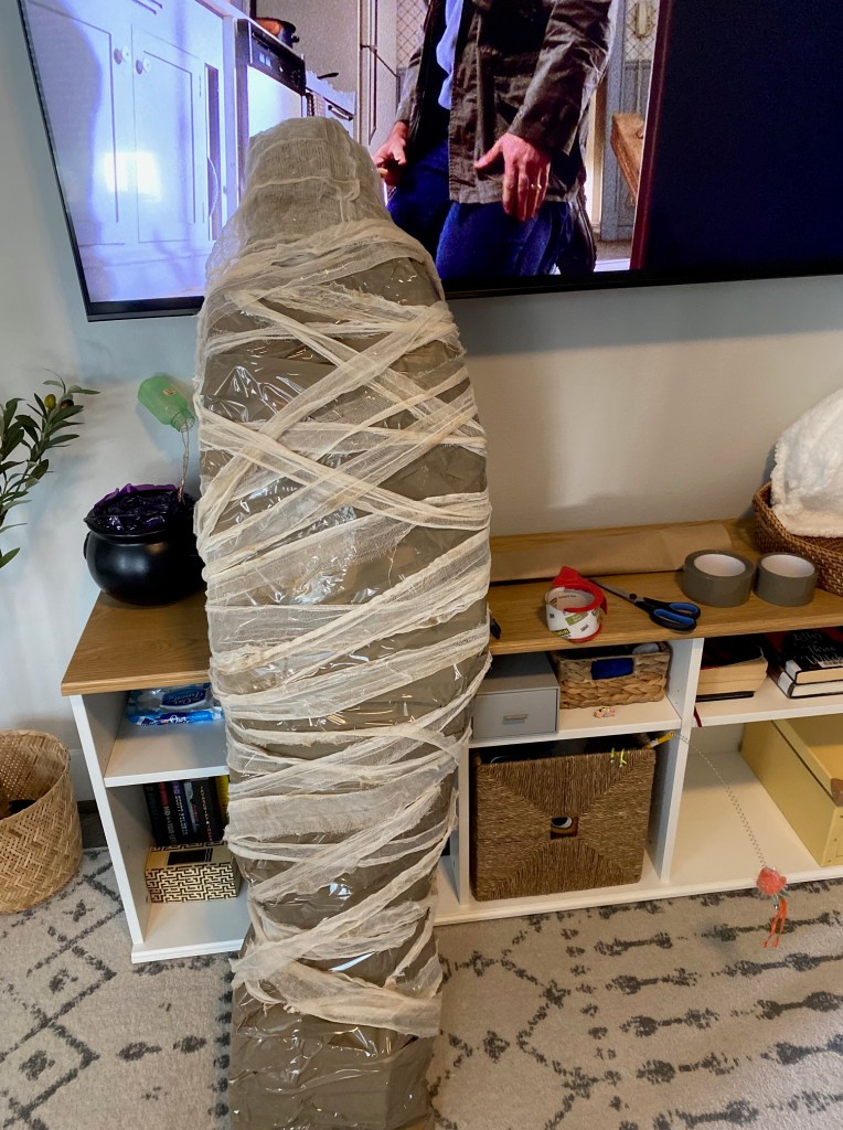 If you’ve walked into any home improvement store lately you’ve seen the huge animatronics on display for Halloween. You want to take one and the dog too home until you see the prices. Now, what I’ve made is nowhere near 12 ft. tall, but you can certainly go bigger with this project. This mummy is made out of recycling and other things I had lying around the house, and was inspired by the many posts of people making realistic looking “body bags”. Extremely cheap project as all I bought was the gauze material.