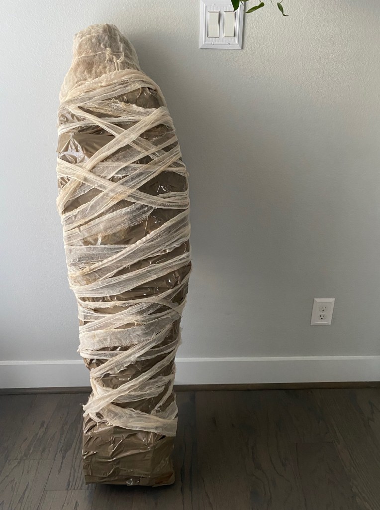 Use the brown packing tape and paper bags to cover any logos/advertising on the boxes. I used Trader Joes paper bags and they covered a lot quickly. Then, I used the brown packing tape, wrapping it around the entire mummy to mimic the linen wrappings. I think you could use tons of gauze instead, but I wanted to keep the cost to a minimum. Wrap the gauze around the mummy and tape into place. I went for a loose asymmetrical style, but you could for sure wrap it very tight.