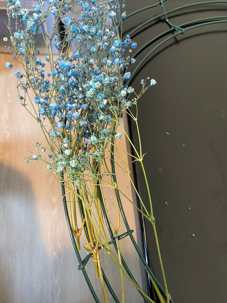 - Once dried, get you wire and form. Baby’s breath branches off helpfully from the main stem leaving about 4 inches of secondary stem. Cut off the main stem, and grab about 3 bunches of flowers. Wrap about 4 inches of wire around the bunches and the form. I like to twist both ends of the wire together and tuck to hide it. Move your way around the form, covering the previous wire.