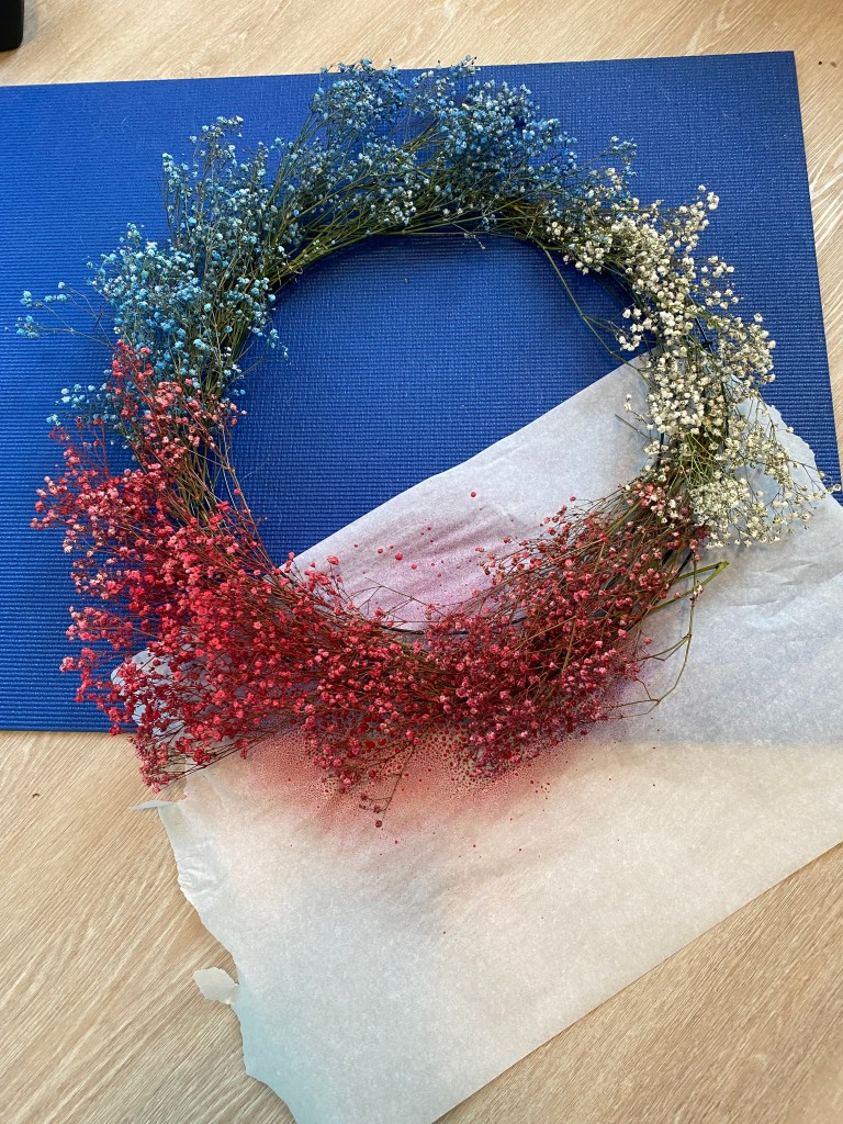 I’ve really gotten into dried florals lately as decor, as it has all the beauty of florals without the recurring expense. Dried floral wreaths are always for sale, but I’ve noticed a few patriotic ones made from what looks like baby’s breath this year. Baby’s breath is usually regarded as cheap filler, but dried and dyed it looks great. (Not all flowers dry well!) Dying the flowers turned out to be the time suck as I developed this project, as dying the water the desired colored took way longer than I remember from 3rd grade science class and did not have the desired vibrancy. Altogether, you can make this wreath from way less than the $120 price tag I’ve seen online.